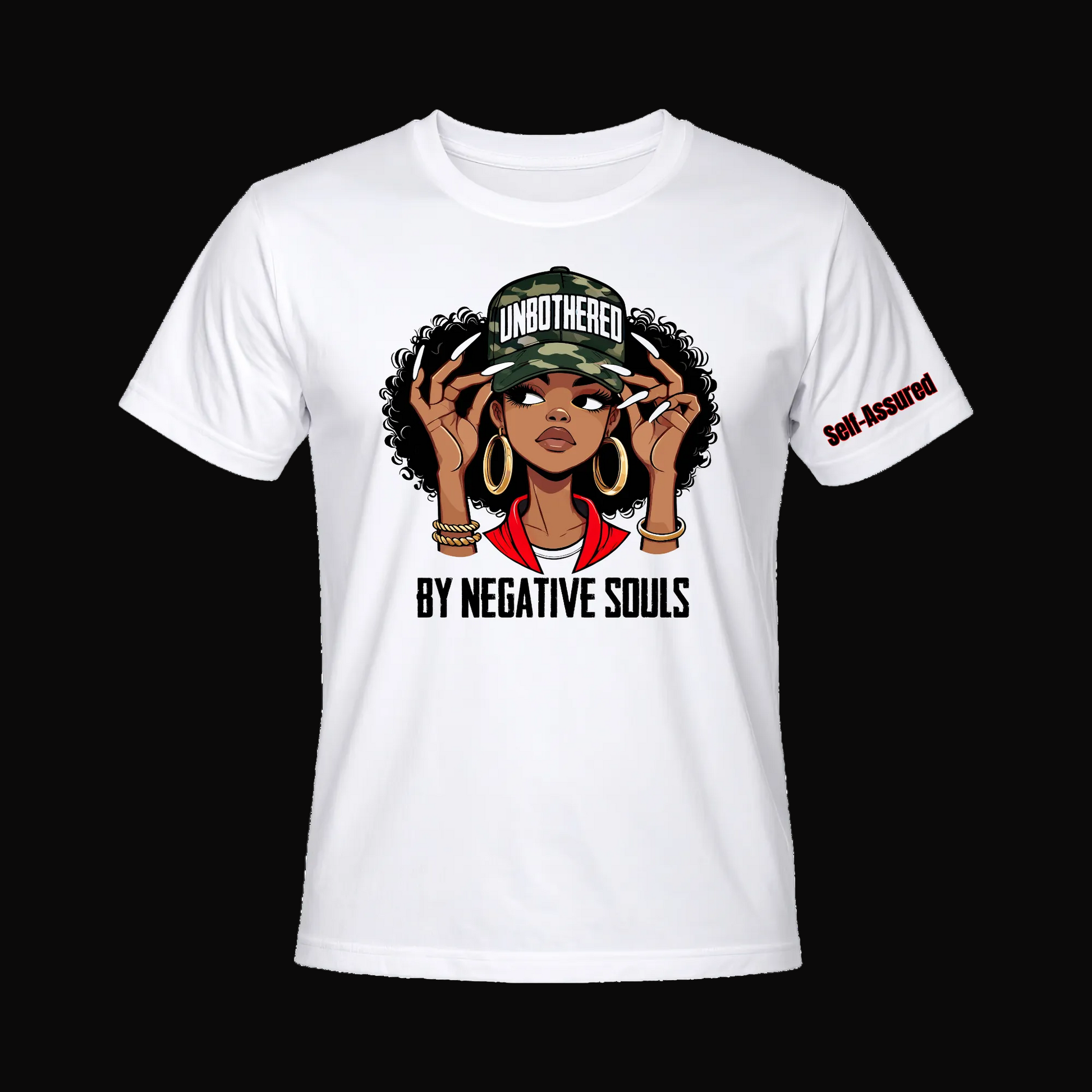 Unbothered By Negative Souls T-shirt rise above the noise with this curated designed for those who refuse to let negativity dictate their energy. The premium t-shirt features a bold statement graphic that communicates your mindset without apology, while the tactical camo hat adds an edgy, confident edge to any outfit. Perfect for everyday wear or making a statement, this set combines comfort with attitude. Whether you're navigating challenging situations or simply embracing your strongest self, these pieces serve as wearable reminders to stay grounded and unbothered. Quality construction meets meaningful messaging in a collection that speaks to your values.